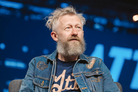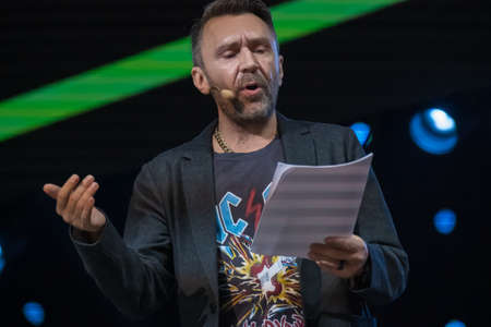 Moscow, Russia - April 23, 2018: Russian rock musician celebrity Sergey Shnurov performs at the business conference