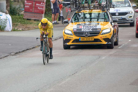 Saint Germain - Bourgogne Franche Comte - France - September 19, 2020 : Primoz Roglic of Team Jumbo - Visma loses his yellow jersey at the last stage during the Tour de France 2020, cycling race stage 20, Lure - La Planche des Belles Filles (36 km Timetri