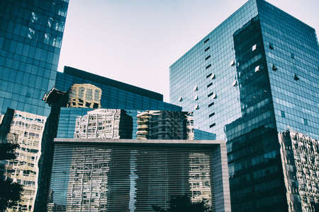 Corporate buildings and a shopping mall made of glass windows reflects the buildings on the other side of the street