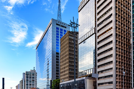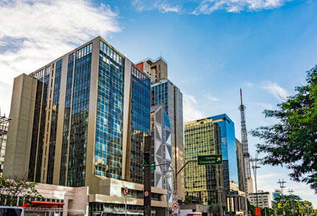 Commercial buildings with glass facades reflecting the sky on Paulista Avenue in Sao Paulo