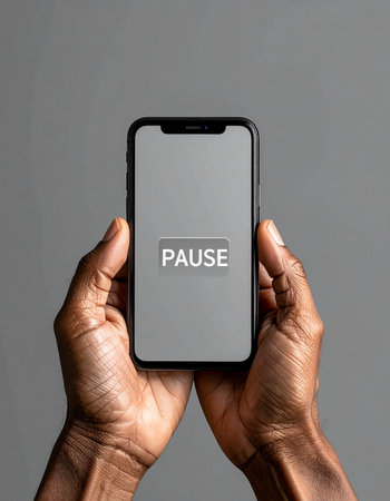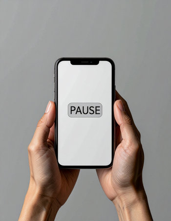 A person holds a smartphone displaying a 'Pause' button, symbolizing the crucial need for a digital detox.