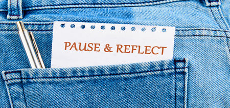 Conceptual pause and reflect symbol. Pause and reflect words written on a piece of paper sticking out of a jeans pocket