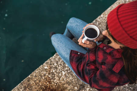 Beautiful woman enjoying her day in the lake with a mug of hot coffee