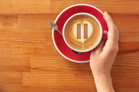 Coffee Break. Woman with cup of cappuccino at wooden table, top view