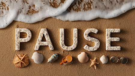 Word pause written on beach sand with seashells and sunglasses invites for vacation and taking a break