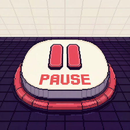 Features a pixelated Pause button with red text and symbols, rendered in a retro 8-bit style, set against a tiled background with vintage game vibes.