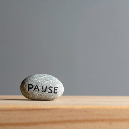 In a quiet, minimalist setting, a smooth stone sits on a wooden surface, carrying a simple but powerful message: PAUSE.
