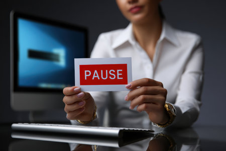 A person holding a bold red pause card in front of a computer, symbolizing a break. The modern office setup highlights a moment of reflection and communication at work.