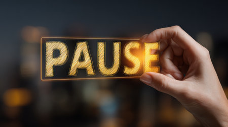 A hand is shown gripping a glowing sign that says pause, with a softly blurred city skyline illuminated in the background. The scene captures a moment of reflection in a bustling urban environment.