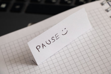 Pause and smiley handwritten on a piece of paper and left