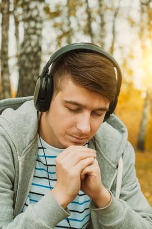 Toned Photo of Young Man in a Headphones in the Autumn Forest Alone