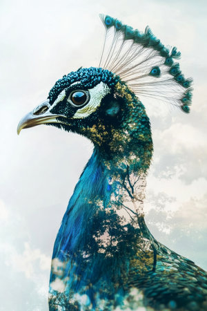 The artwork features a peacock's elegant profile combined with a lush natural landscape, creating a stunning visual that celebrates wildlife and artistic expression.