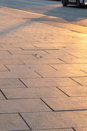 A captivating sunset casts long shadows on a patterned pavement, creating a beautiful display of light and shadow.