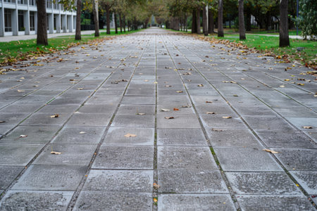 A serene walkway paved with tiles stretches through a lush green park. Ideal for nature lovers, this image captures a tranquil path, inviting exploration and relaxation.