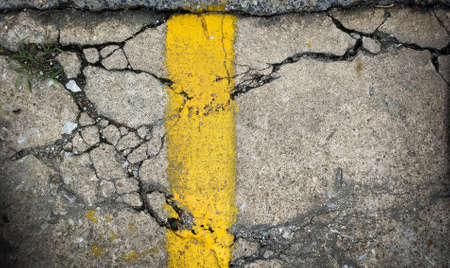 Old damaged street surface with yellow line as background