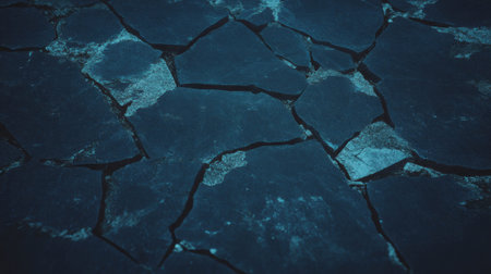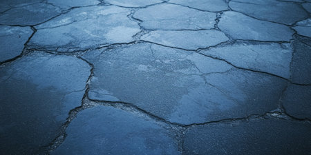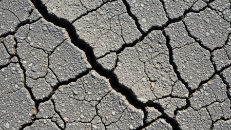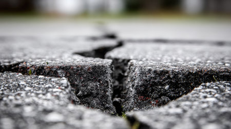 Detailed macro shot of a cracked asphalt road, highlighting rough textures and deep fissures with subtle light reflections on the uneven surface.