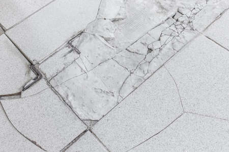Old gray broken tile floor construction repair background, renovation concept.