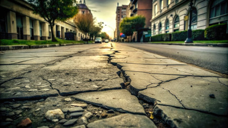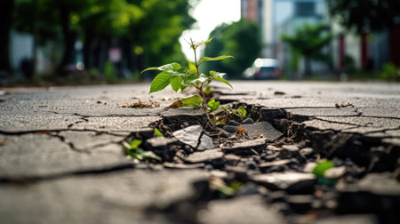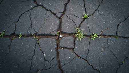 Cracked asphalt road with weeds growing through gritty urban setting