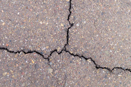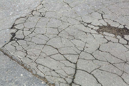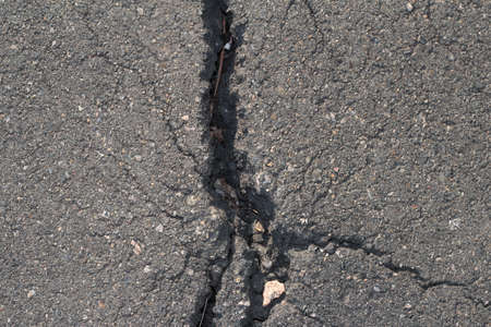 Cracks in the asphalt road, close-up. Abstract background