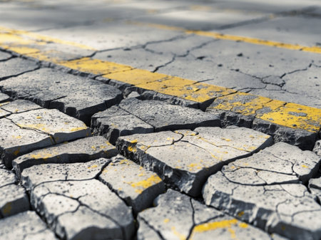 AI Generated. Pavement surface texture featuring cracked stones and worn yellow stripes perfect for urban design backgrounds or construction themes