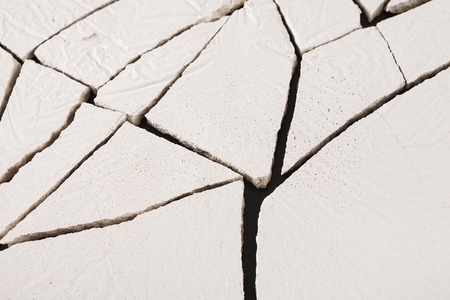 Fractured white concrete background. Old cracked plaster floor top view, copy space