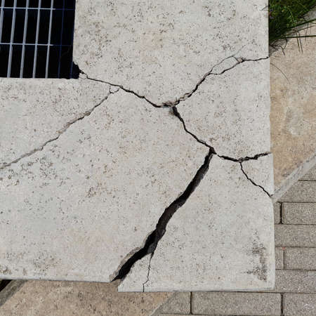 Weathered and cracked pedestrian walkway in bad condition. Urban background of decay and damage.