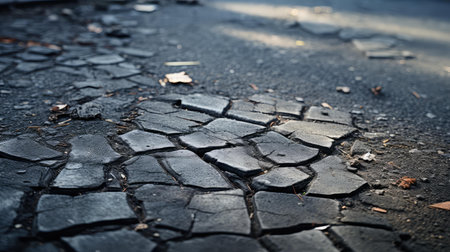 Detailed view of cracked asphalt, its rugged texture and weathered surface. useful for urban infrastructure studies, contrasts in materials, or backgrounds in design projects. Generative AI