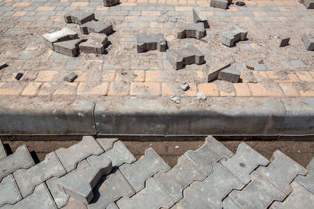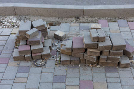 repair work on the restoration of the pedestrian sidewalk paving stone tiles and installing curbs, a close-up of road works nobody.