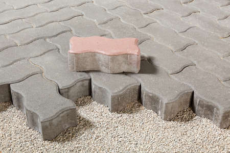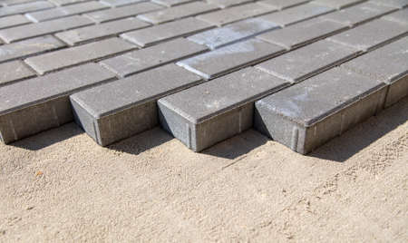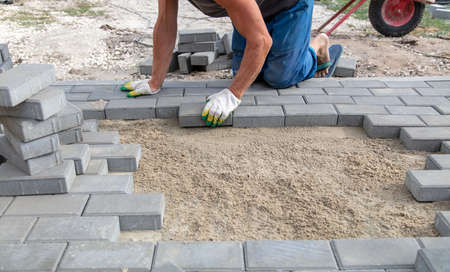 Professional worker layers installing laying gray concrete brick the street in city on leveled sand foundation base