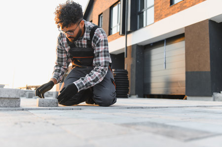 Construction worker installing and laying pavement stones on terrace, road or sidewalk. Worker using stones to build sidewalk