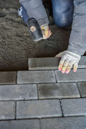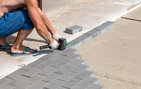 A craftsman in gloves with a rubber mallet lays concrete blocks on a gravelly sand base. Laying concrete blocks on the sidewalk.