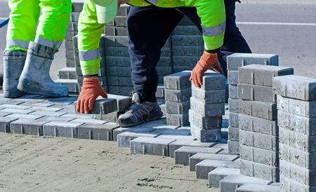 Construction of a sidewalk of blocks of workers in the summer.