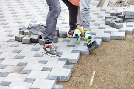 Construction workers installing and arranging precast concrete pavers stone for road at the construction site.