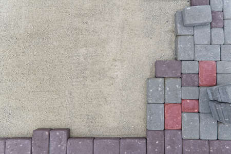 New colorful paving stones along a directional cordon on a prepared flat surface