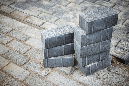 Gray concrete bricks are stacked in a construction area, showcasing a textured surface with additional surrounding pavers on the ground.
