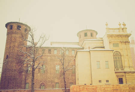 Vintage looking Palazzo Madama (Royal palace) in Piazza Castello Turin Italy - winter view with snow