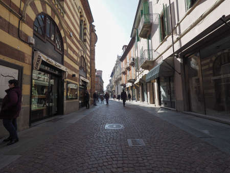 CHIERI, ITALY - JANUARY 14, 2015: Tourists visiting Via Vittorio Emanuele high street in the city centre