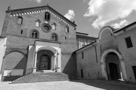 Facade of the medieval abbey of Morimondo (Milan, Lombardy, Italy). Black and white