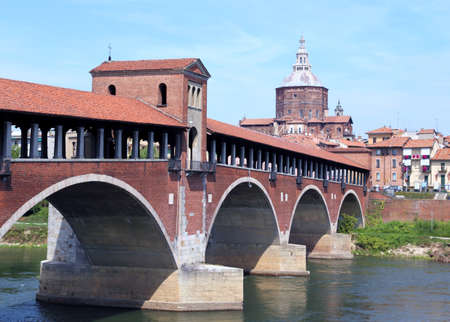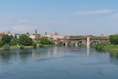 Skyline of Pavia , Ponte Coperto(covered bridge) is a bridge over the Ticino river in Pavia at sunny day, Pavia Cathedral background, Italy