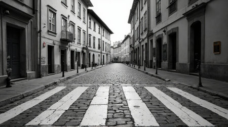 Historic European cobblestone street with pedestrian crossing, evoking timeless urban charm and travel.