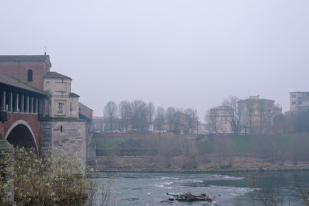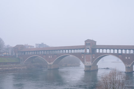 View of the Ancient Covered Bridge and the city surrounded by fog in winter. Pavia. Italy. Lombardy