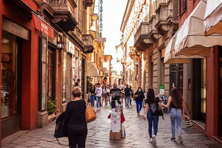 BOLOGNA, ITALY 17 JUNE 2020: Bologna alley detail with people walking