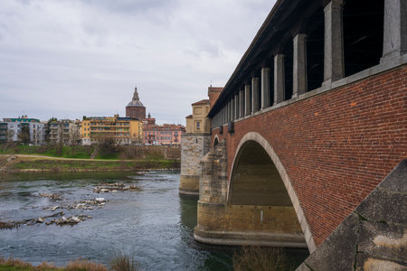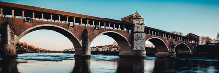 Old covered bridge on Ticino river in Pavia, Lombardy, Italy