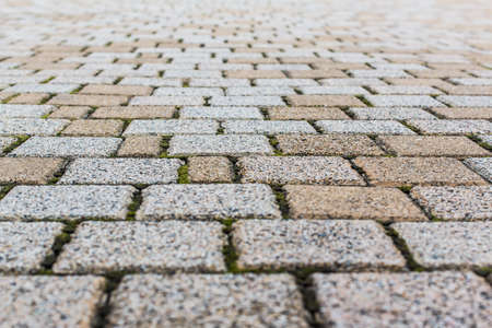 Perspective view of gray and yellow brick stones on street and sidewalk