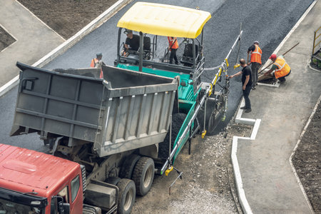 Construction workers are engaged in asphalt paving on a road surface with heavy machinery in an urban area, showcasing teamwork and infrastructure development efforts.