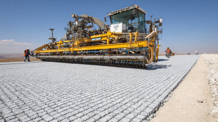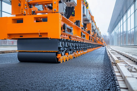 A cutting-edge paver machine is efficiently laying down a smooth layer of asphalt on a construction site. Workers supervise the progress as the sun rises on a new project.