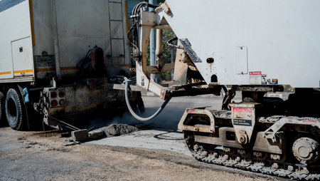 A heavy machinery unit is busy paving a new road with asphalt at a construction site under a clear blue sky. Workers are present, highlighting the development process.
