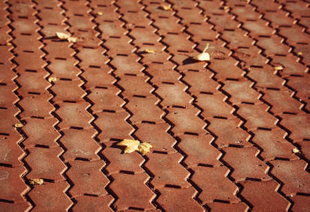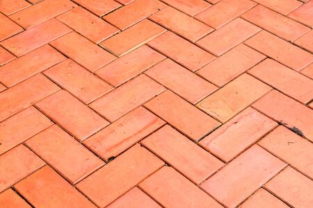 Sidewalk pavement in rust color, herringbone terracota pattern in sunlight. Advertisement of ceramics bricks, street surface. Copy space. Background for quotes. High quality photo