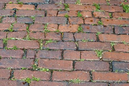 A strong weed growing through red brick wall floor stone between stone slabs.
