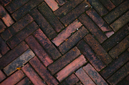 A high-contrast, close-up of reddish-brown paving stones in a zigzag pattern, with a heavy vignette creating a moody and textured background.